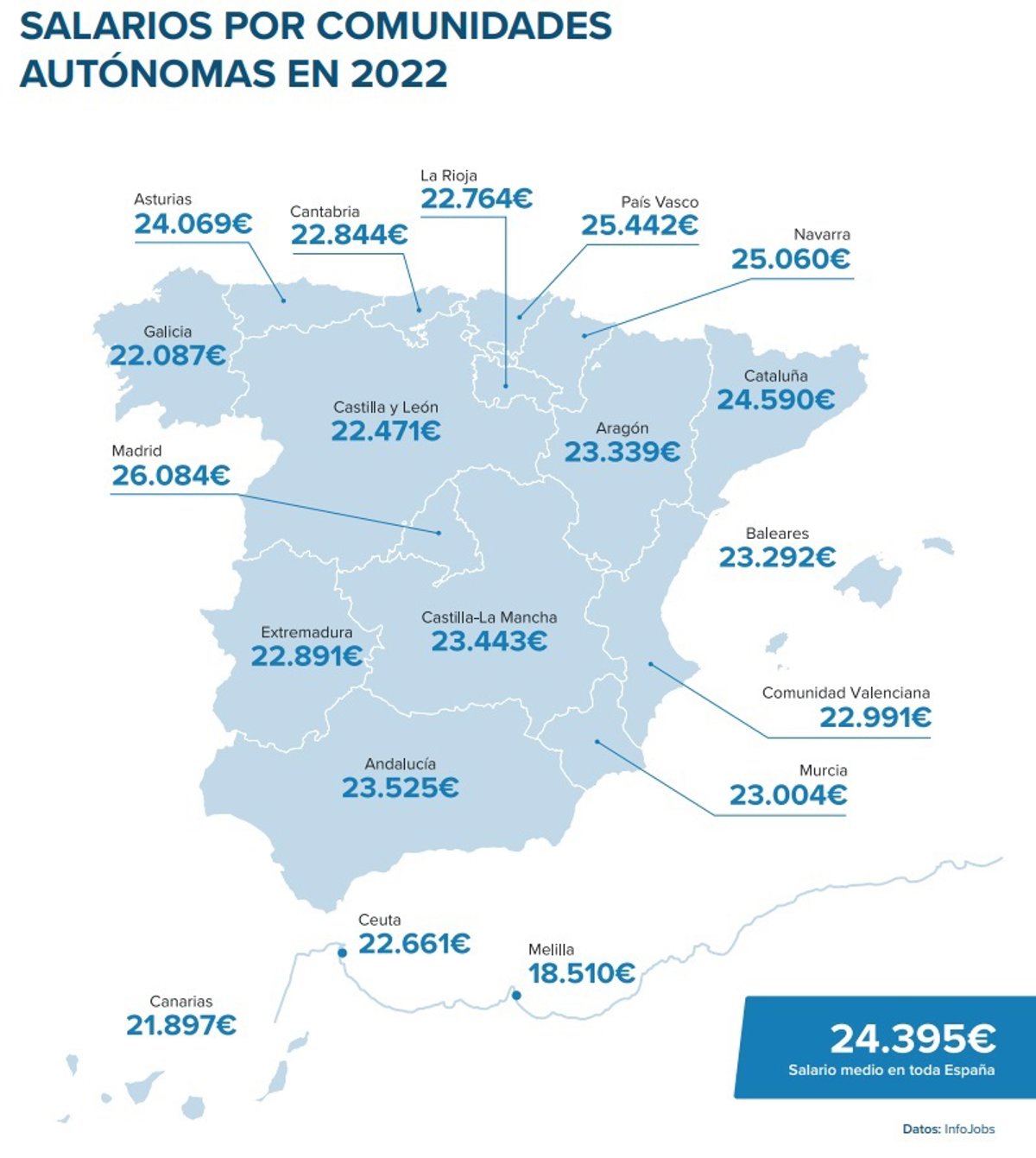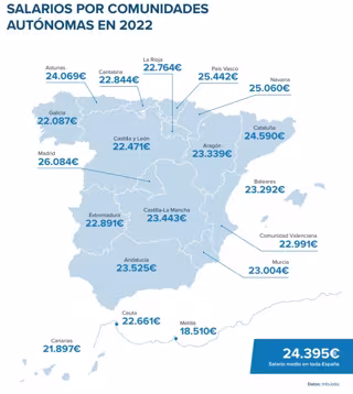 Archivo - Salarios medios en cada comunidad autónoma en 2022, según el informe Estado del mercado laboral en España 2022, elaborado por InfoJobs y Esade - INFOJOBS - Archivo