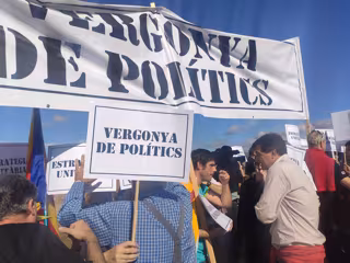 Antes de comenzar el acto, unas veinte personas se han situado al lado del escenario con la pancarta 'Vergüenza de políticos' y exhibiendo carteles con el lema 'Estrategia unitaria', y el presidente de ERC en el Parlament, Sergi Sabri, y la portavoz del partido, Marta Vilalta, se han acercado a hablar con ellos.