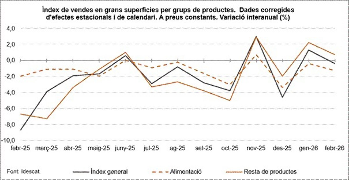 El índice de ventas en grandes superficies de Catalunya ha disminuido un 0,4% interanual, a precios constantes (eliminando el efecto de la inflación) y corregidos los efectos estacionales y de calendario, según datos del Institut d'Estadística de Catalunya (Idescat).