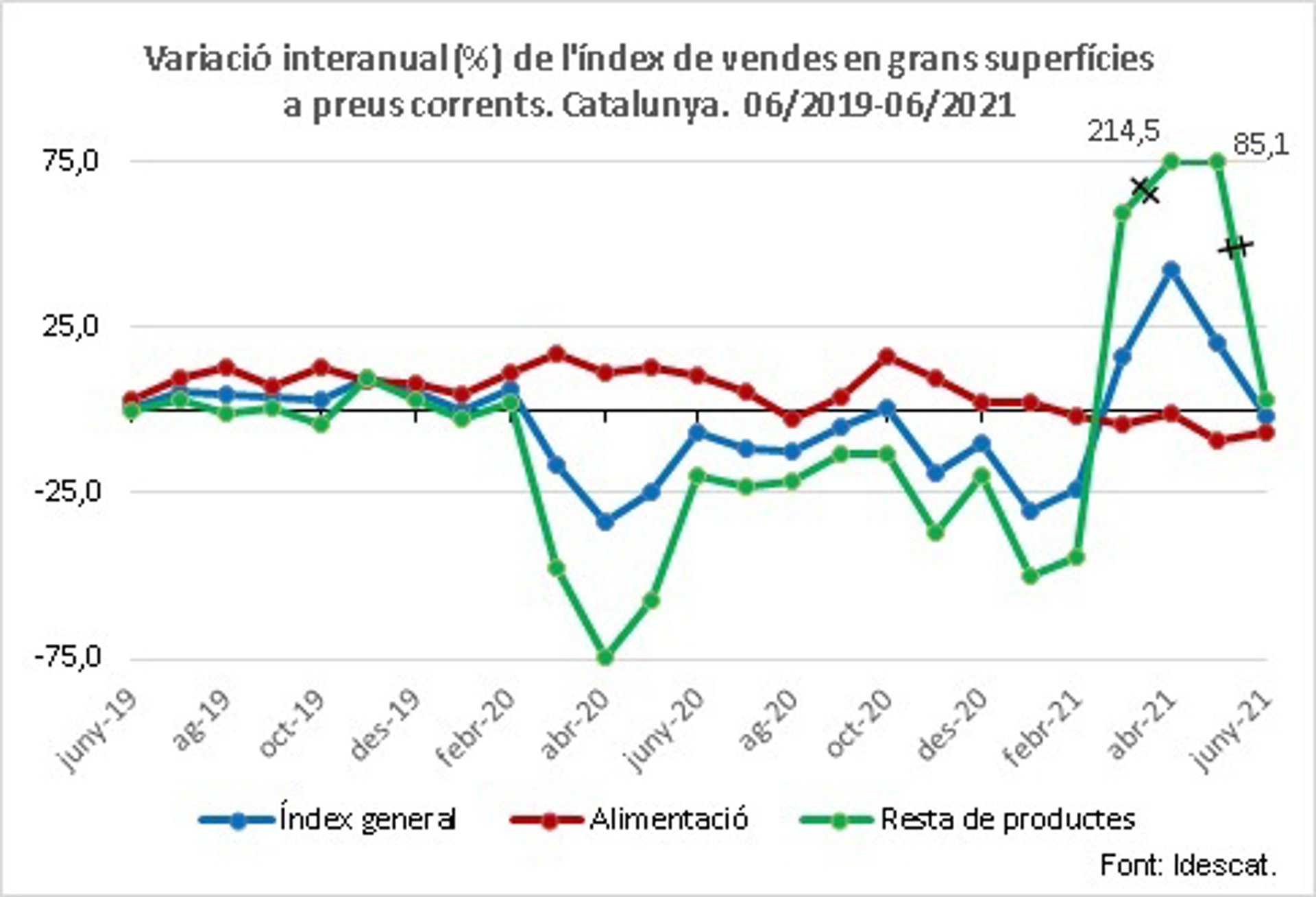 Las ventas en las grandes superficies de Catalunya a precios corrientes han disminuido un 1,7% en junio respecto al mismo mes de 2020, según ha indicado el Govern en un comunicado este martes con los datos del Instituto de Estadística de Catalunya (Idescat).