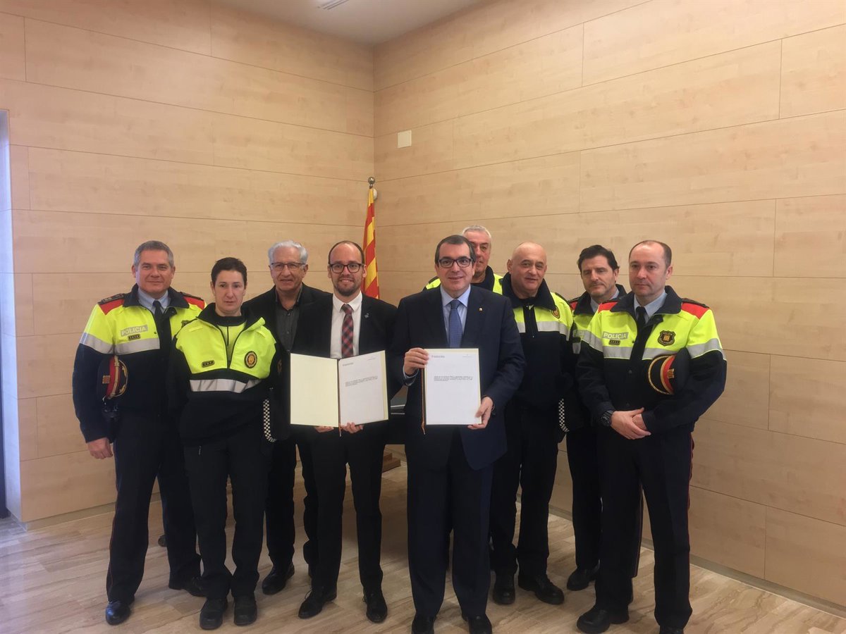 El conseller de Interior de la Generalitat, Jordi Jané, y el alcalde de Gironella (Barcelona), David Font, han firmado un convenio de colaboración en materia de seguridad pública que permitirá que los vigilantes de este municipio puedan usar la red de radiocomunicaciones móvil de emergencias Rescat.