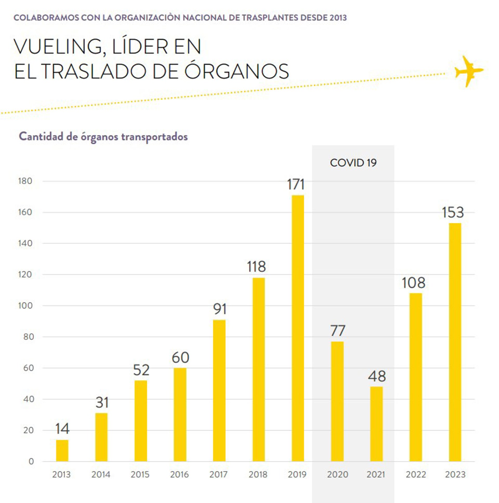 Número de órganos trasladados anualmente por Vueling desde 2013, cuando la aerolínea empezó a colaborar con la Organización Nacional de Trasplantes (ONT) - VUELING