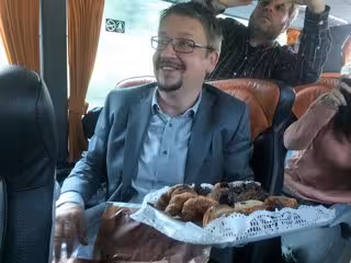 El candidato de los 'comuns' a las elecciones del 21 de diciembre, Xavier Domènech, ha viajado este domingo en el autobús de los periodistas en el trayecto Barcelona-Girona y, como buen invitado, ha llevado unas pastas para desayunar.