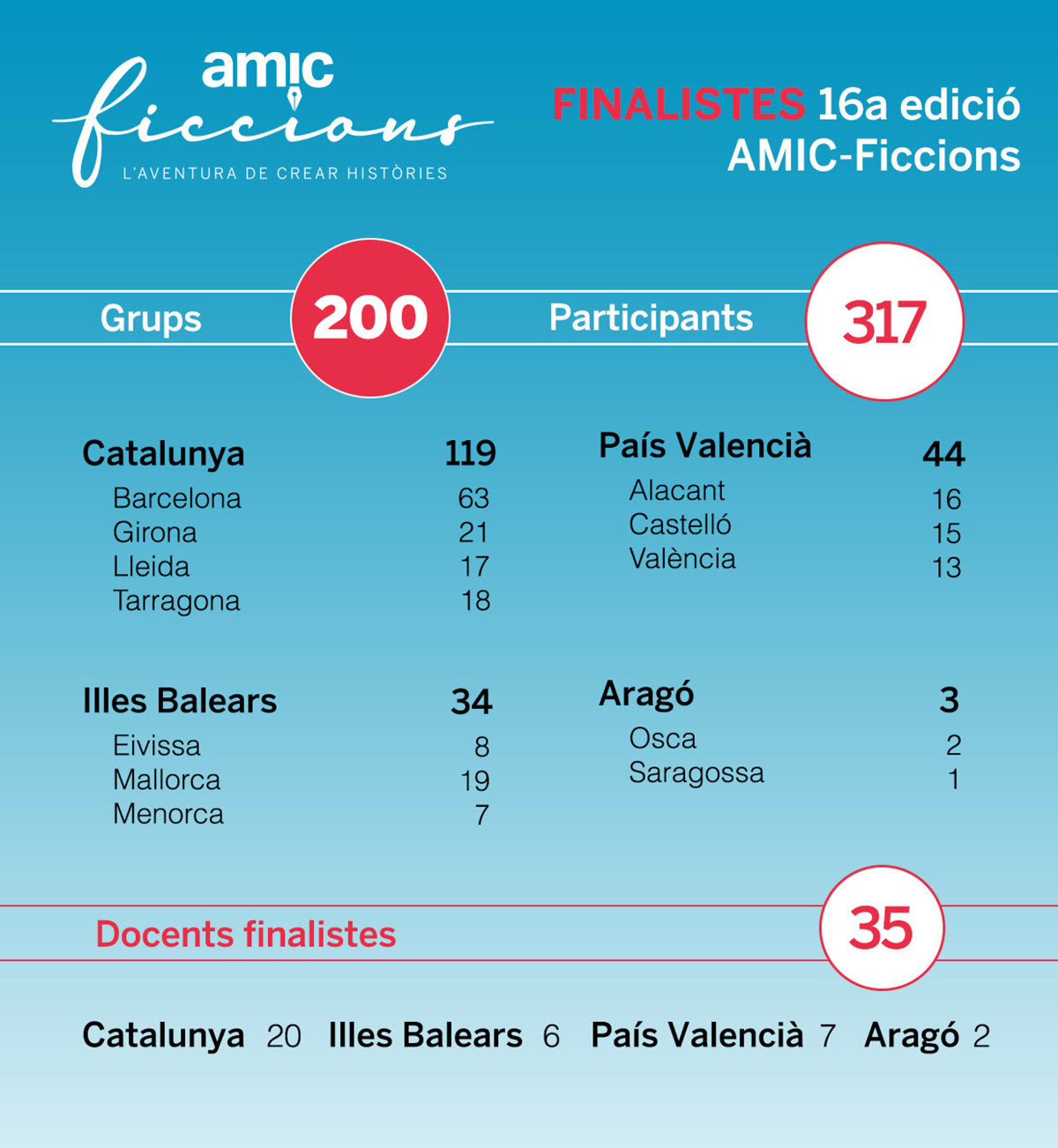 El XVI concurso literario Amic-Ficcions, de fomento de la escritura y la lectura en catalán entre los jóvenes a través de la red, ha seleccionado 200 historias finalistas: 119 de Catalunya, 44 de Comunidad Valenciana, 34 de Baleares y 3 de Aragón.