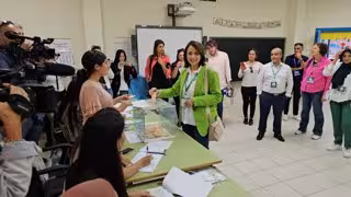 La candidata a la Presidencia de la Ciudad Autónoma de Melilla por Coalición por Melilla (CPM), Dunia Almansouri, este domingo en el momento de votar. - COALICIÓN POR MELILLA