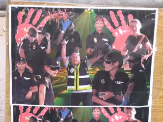 Los activistas además hacían gestos obscenos e incluso mostraron navajas ante la pasividad de la policía marroquí, que les permitió actuar así y situar de nuevo dichos carteles, que son un montaje en el que se han juntado las imágenes de varias agentes de la Policía Nacional durante su servicio en el puesto fronterizo mientras un agente masculino hace un movimiento con las manos, y en el fondo varias manos manchadas de sangre.