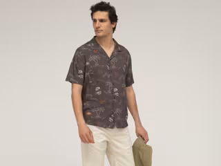 Para crear el primer look de festival, el estilista de Boston ha escogido una camisa resort con cuello solapa o también denominada tipo bowling, con estampado figurativo de una temática veraniega con palmeras, tiburones o soles en colores naturales. Según Gustavo Alted: “Esta camisa aporta confortabilidad en tus looks, confeccionada con viscosa para dar suavidad y ligereza a la prenda”.
