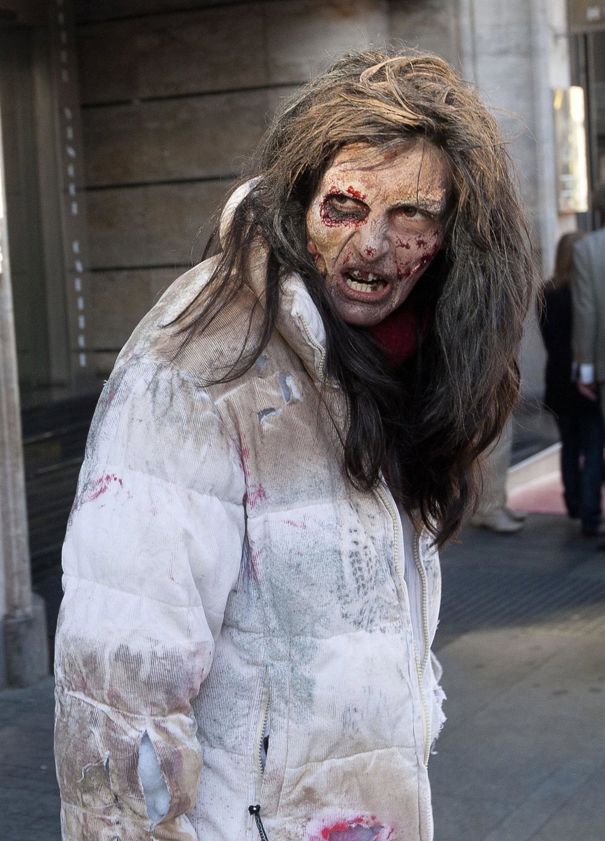 Como toque final, puedes añadir un poco de color verde para dar sensación de enfermo, añadir sangre de mentira, que puedes conseguir simplemente mezclando sirope de caramelo con colorante alimenticio de color rojo, y con unas lentillas blancas conseguirás un look total. Ya estás listo para pasar una noche terrorífica.