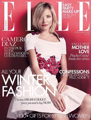 Por si fuera poco, la estrella de Hollywood protagoniza la portada de la edición británica de la revista de moda y belleza 'ELLE' en el número del mes de diciembre. Cameron Díaz aparece espectacular haciendo gala de una belleza madura enfundada en un clásico vestido blanco con detalles de terciopelo en hombros y cintura en color rosa fuscia.