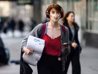 A woman wearing a protective mask carries a toilet paper package on the street on March 13, 2020 in New York City. President Donald Trump is expected to declare national emergency over coronavirus crisis today. - 2020 GETTY IMAGES / JEENAH MOON - Archivo