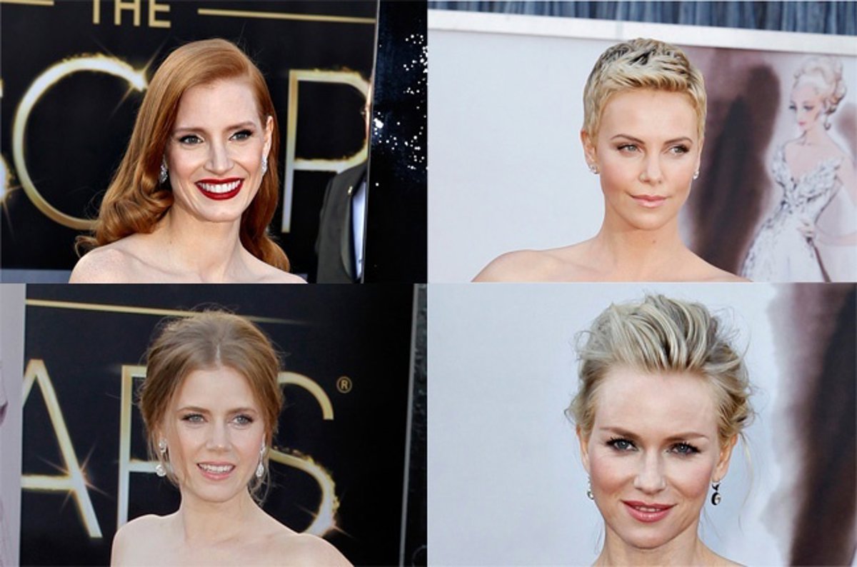 En cuanto a los peinados, triunfan los recogidos bajos y sencillos, desenfadado, como Amy Adams o totalmente tirante, como lució Natalie Portman. Los tupés bajos también estuvieron presentes, siendo Naomi Watts la más favorecedera con este look. De moños pasamos a las ondas de agua, un estilo muy años cuarenta por el que apostaron muchas famosas como Catherine Zeta-Jones y Reese Witherspoon.