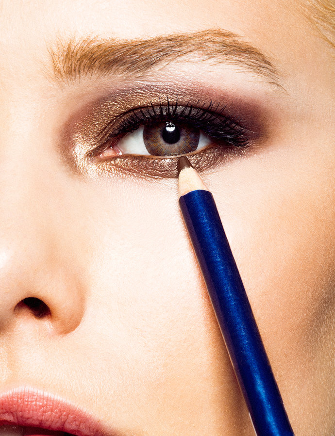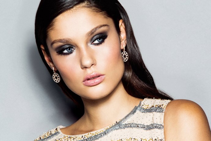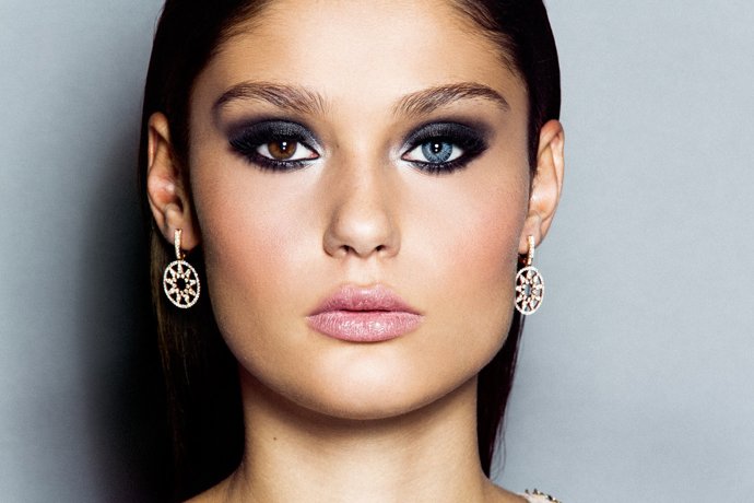 Para dar mayor intensidad, fuerza y carácter a la mirada utiliza un lápiz de ojos en tono marrón para el párpado inferior y pestañas postizas en el párpado superior y aplica gran cantidad de máscara en color negro. Maquilla las cejas ligeramente, en un tono topo, para darles más importancia y que contrasten con la sombra del párpado.