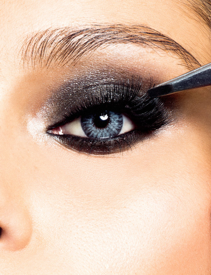 Una vez aplicado, y perfectamente difuminado, utiliza pestañas postizas en el párpado superior y aplica rímel de color negro para definirlas y espesarlas.