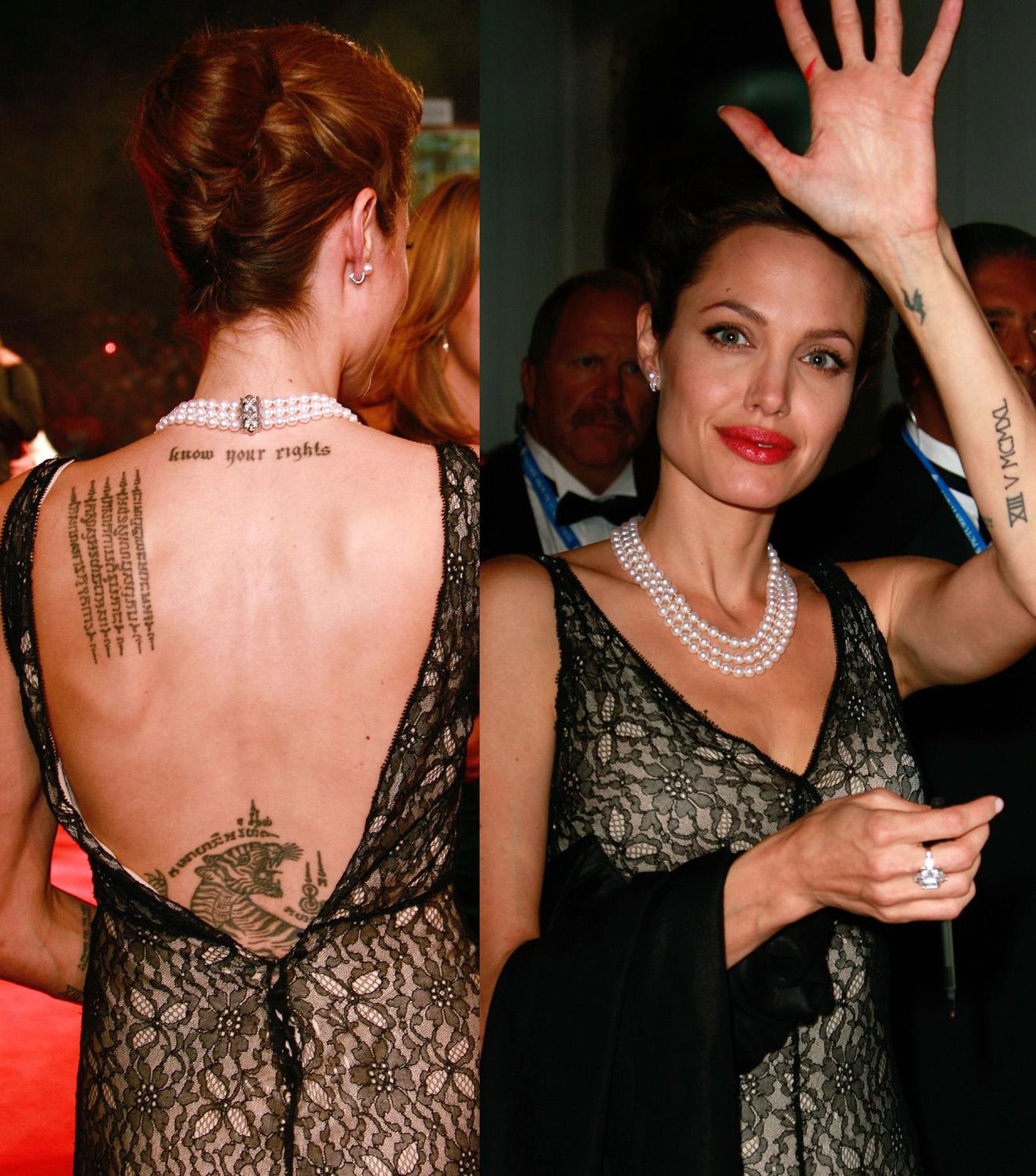 Angelina Jolie sin duda es la actriz más tatuada del mundo, con más de una docena de grabados sobre su cuerpo. Destacan por ejemplo una pantera en la zona de la rabadilla, un tatuaje camboyano en su homoplato izquierdo o una gran cruz en la pelvis. Solamente se ha borrado con láser un tatuaje con el nombre una ex pareja (Billy Bob Thorton) y su último dibujo, ha confesado que se lo ha hecho en una zona íntima sólo visible "para Brad".
