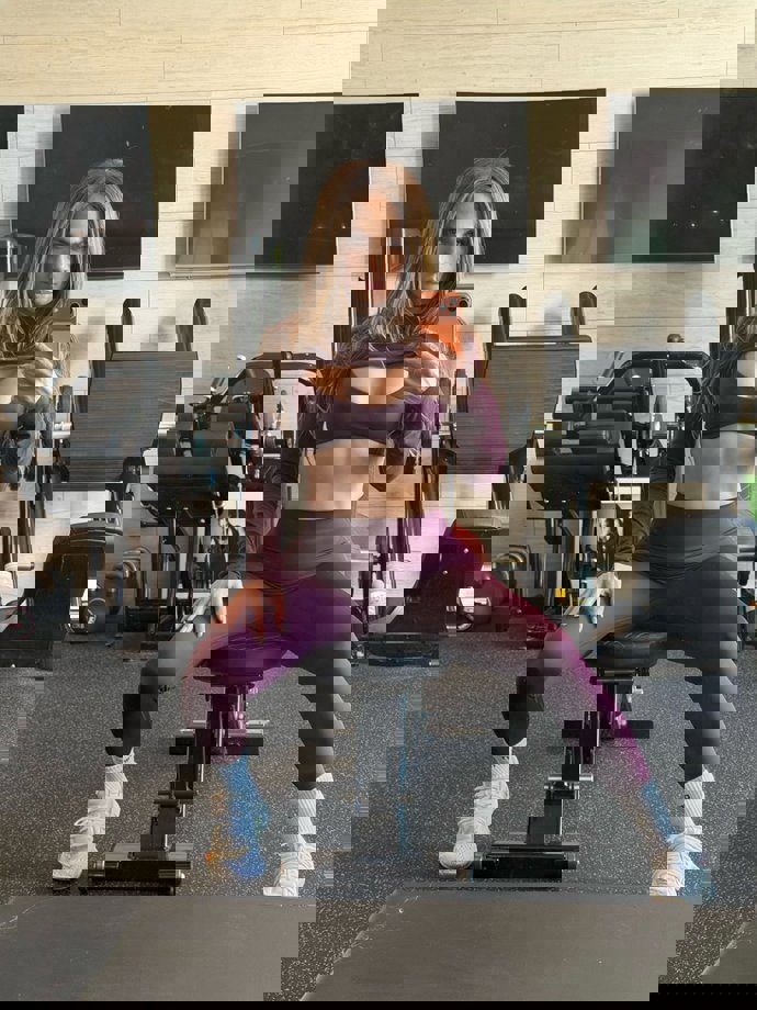 La indumentaria la forman tres piezas en consonancia con ese tono ciruela: un top deportivo con gran escote que recoge el pecho y aporta ligereza, ideal para practicar cualquier tipo de mujer que quiera estar despreocupada durante sus horas de ejercicio. Además, lo ha combinado otra prenda perfecta para el momento del calentamiento: maniguitos, estos abrigan los brazos en los minutos previos. Por último, no podían faltar los leggings de cintura alta, la clave de todo el look.