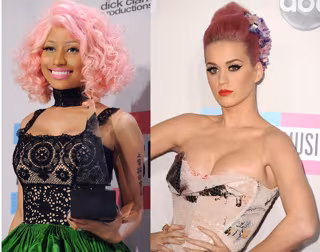 Un mismo tono y dos formas de llevarlo. Mientras Katy Perry eligió un elegante recogido coronado por un tocado de Vivienne Westwood, Nicki se decantó por una media melena rizada y alocada inspirada en Ferchie, la peluquera soñadora del musical 'Greasse'.