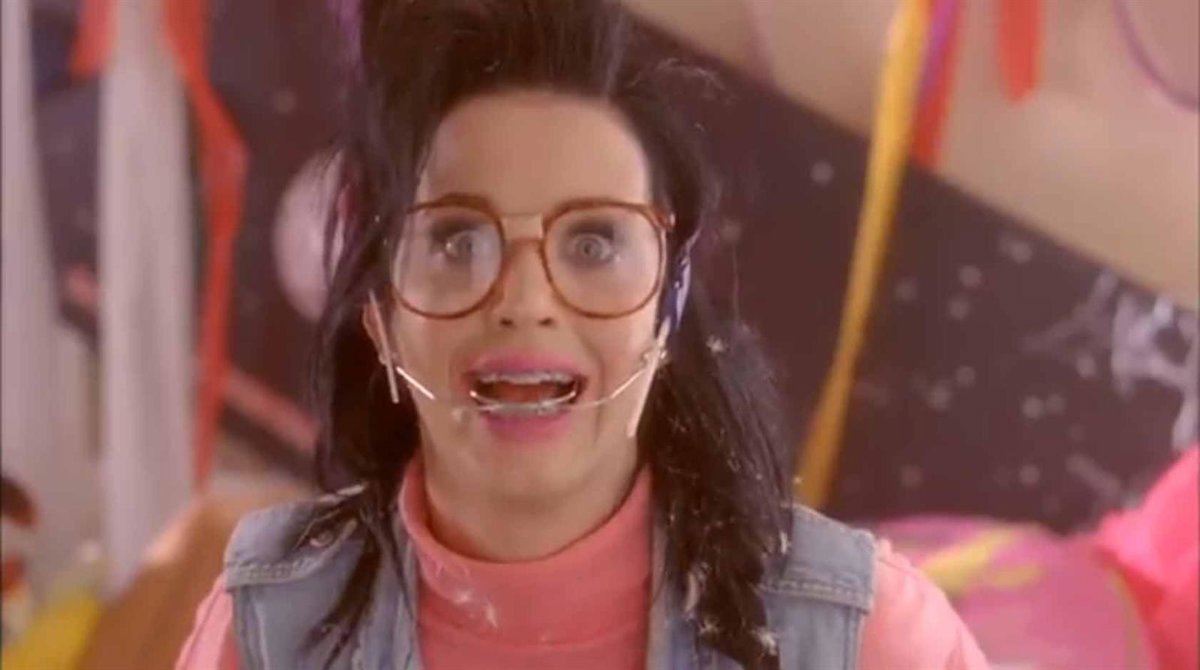 A Katy no le falta detalle en lo que a infamias se refiere: gafotas de culo de vaso con tirita incluida y pelufo encrespado con una ligera capita de grasa. Un look 100% antimorbo del que esperemos que la cantante sólo haya aprendido que semejantes espantos no deberían repetirse a menos que busque que la reacción entre el público sea de auténtica arcada.