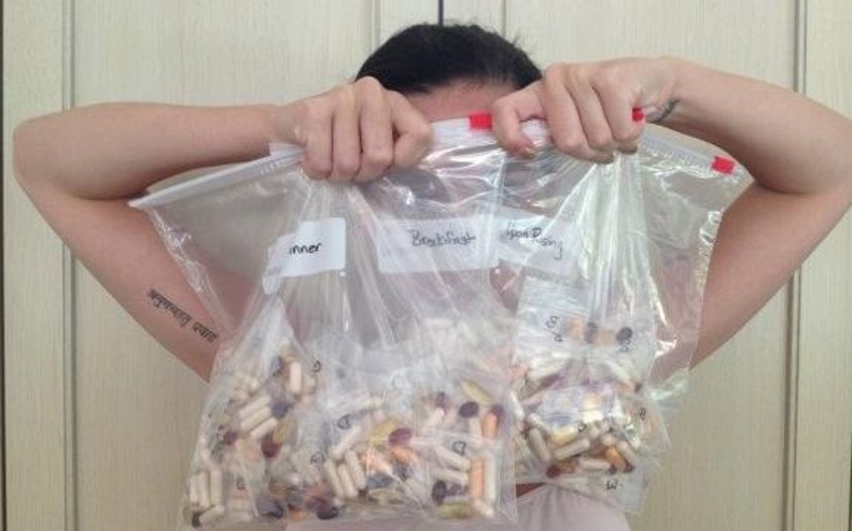 Se tratan de tres bolsas llenas de pastillas que son vitaminas con las que complementa sus comidas, tal y como indica en la fotografía para el desayuno, comida y cena.