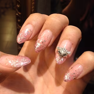 Una manicura sin duda muy navideña en la que se aprecia una influencia de la francesa, eso sí sin definir una línea clara, con un toque rosado y con diferentes tipos de brillantes.