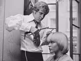 British celebrity hairdresser Gavin Hodge styling hair of his wife, former debutante Jayne Harries, in his Mayfair salon, London, UK, 24th August 1968. (Photo by Dove/Daily Express/Getty Images) - DOVE - Archivo