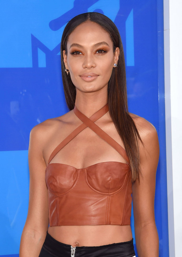 5.La osadía de las sombras de Joan Smalls y Stella Maxwell. Las dos modelos arriesgaron con los colores que escogieron para maquillar sus ojos. Tan poco convencional era el naranja de Smalls, que combinaba con su top, como el rosa de Maxwell, que también llevaba rosa en su conjunto de Jeremy Scott.