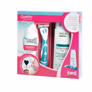 'Quattro for Women Bikini', el nuevo accesorio de belleza femenino de Wilkinson, se une a la crema hidratante Nutrisoft de L'Oreal en un pack que permitirá a sus usuarias disfrutar de una piel aterciopelada y lucir unas piernas de seda todo el verano.