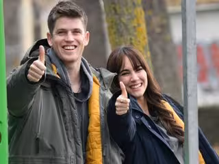 Divertidos y muy cómplices también en sus ratos libres, la pareja saludó con una inmensa sonrisa y el pulgar hacia arriba a los fotógrafos que estaban inmortalizando la dura jornada de rodaje en plena calle. A juzgar por las imágenes, la joven pareja está llevando a la perfección esta primera experiencia trabajando juntos y conviviendo en el día a día.