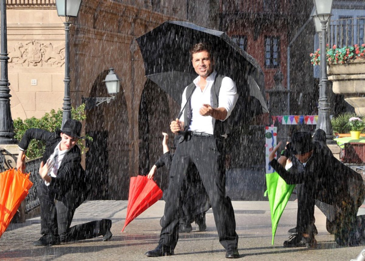 En otra escena, Bustamante aparece cubriéndose con un enorme paraguas negro para protegerse de la lluvia, ficticia por exigencias del guión, a juego con su clásica indumentaria de pantalón y chaleco y unas modernas gafas de cristales de espejo en verde.