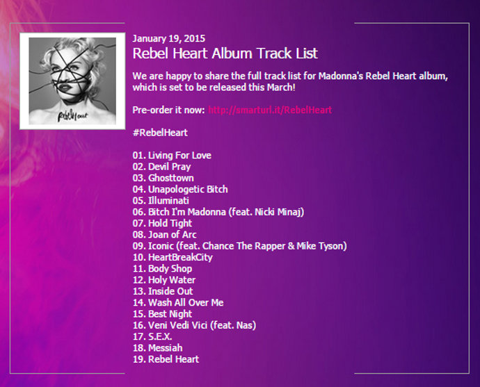 El caso es seguir un poco la máxima de 'que hablen de mí, pero que hablen'. Y lo consigue, sin duda, porque es Madonna. El caso es que el CD está ya preparándose para su recta final y salir a la venta al público, aunque la cantante tuvo que hacer una maniobra de poner 5 temas en preventa junto al CD en plataformas digitales debido a las filtraciones.