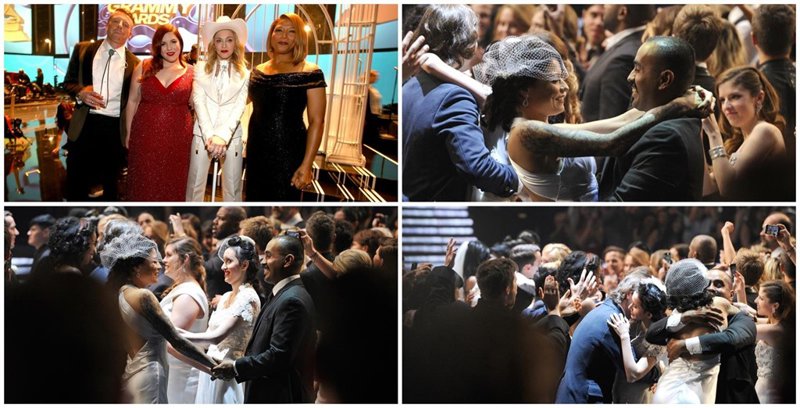 Tanto parejas heterosexuales como homosexuales se dieron cita en el estadio Staples Centre de Los Ángeles para llevar a cabo una increíble iniciativa que permaneció en absoluto secreto hasta unas horas antes de la entrega de premios. El New York Times contó una de las sorpresas mejor guardadas de esta edición, revelando que el productor de los Grammy, Ken Ehrlich, le propuso la idea a Macklemore y Ryan Lewis tras enterarse que los conciertos del dúo han motivado más de una propuesta de matrimonio.