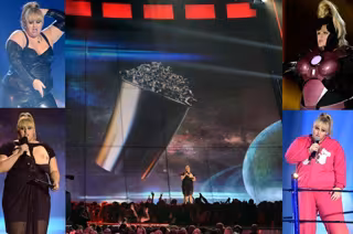 Hemos podido ver a Rebel Wilson vestida de Iron Man. También ha parecido en chandal y cuando el público menos lo esperaba se desvestía enseñando otro vestuario que tenía debajo, negro, de cuero y ceñido. Y ha hecho gala con un traje negro y "enseñando el pecho" de plástico. Una burla a hechos que se han dado en otras galas.