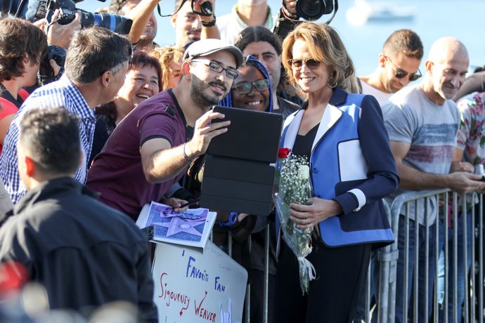 Sigourney Weaver no dudó en fotografiarse con sus fans que la recibieron hasta con pancartas.