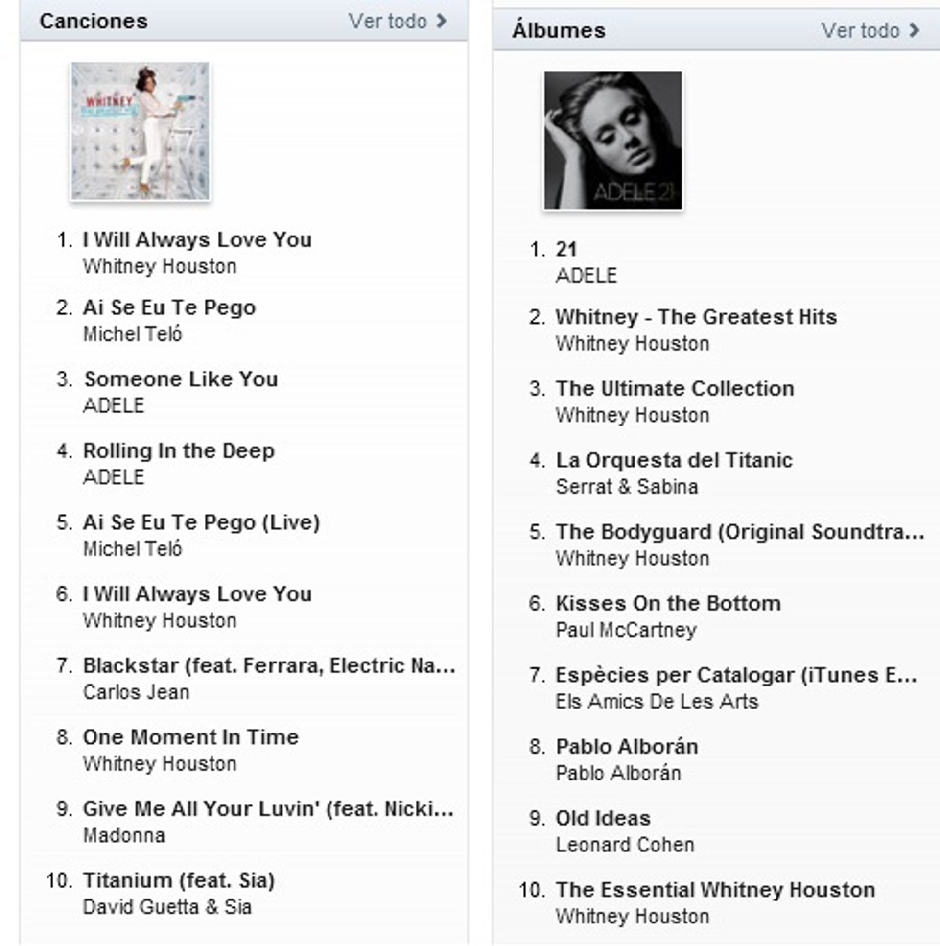 Suele ocurrir que cuando una gran estrella pasa a mejor vida de forma inesperada, el interés de sus fans se reaviva. La pérdida de Whitney Houston no ha sido una excepción, y sus álbumes recopilatorios y canciones más conocidas han superado a estrellas del momento como Adele y pasajeras como Michel Teló.