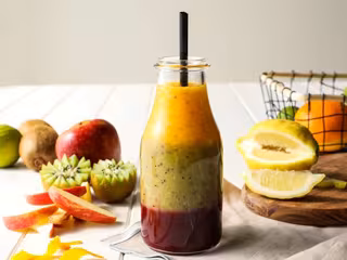 - Multicolor. No hay por qué elegir un solo color para tu smoothie, ya que es posible mezclarlos y obtener un batido de diferentes capas. ¡A los peques de la casa les encantará! Para conseguir esta combinación, tendrás que preparar tres elaboraciones diferentes e irlas vertiendo en un vaso. Primero, para la capa del fondo, que será la más oscura, tritura 40 gramos de remolacha con el zumo de medio limón. Para la siguiente, licua 30 gramos de espinaca y viértelo encima. Por último, exprime zumo de 1 naranja y, junto con una bolsa de gajos de manzana, machaca la mezcla hasta conseguir una textura algo más ligera. Vierte esta última parte del smoothie en el vaso y ¡ya está listo!