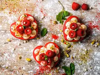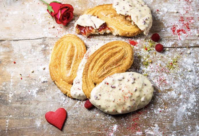 Sus tartaletas de San Valentín, elaboradas con una base de galleta sablé de vainilla, son de un precioso color rojo y se rellenan con crema de queso mascarpone. Como topping llevan frambuesas frescas, polvo de pistacho y chips de chocolate blanco. Sus palmeras, también de chocolate blanco, son su otra apuesta en forma de corazón para el Día de los Enamorados, rellenas de coulis de frambuesa para chuparse los dedos literalmente.