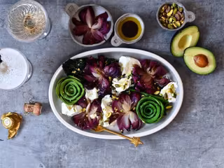 Mientras tanto, corte cuatro rosas de aguacate.Sirva la ensalada en un plato o tazón para "compartir". Arregle todas las flores (cebolla y aguacate) en un plato, añada la mozzarella, rocíe con aceite de oliva, añada la ralladura de limón, los pistachos y agregue pimienta y sal al gusto.