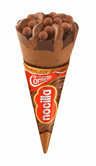 Para completar la gama, Cornetto también dispone de un super cono de 140 ml que combina helado con sabor a Nocilla Original y Blanca, salsa del mismo sabor en su interior y decorado con trocitos de avellana caramelizada.
