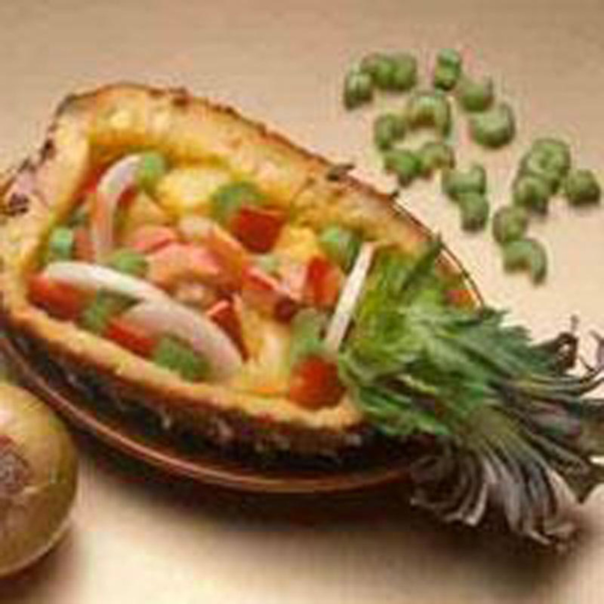 Cortar la piña por la mitad a lo largo, sacar la pulpa y trocearla. Partir la cebolla en aros, el pimiento y el apio en trocitos y rellenar con ello las mitades de la piña.