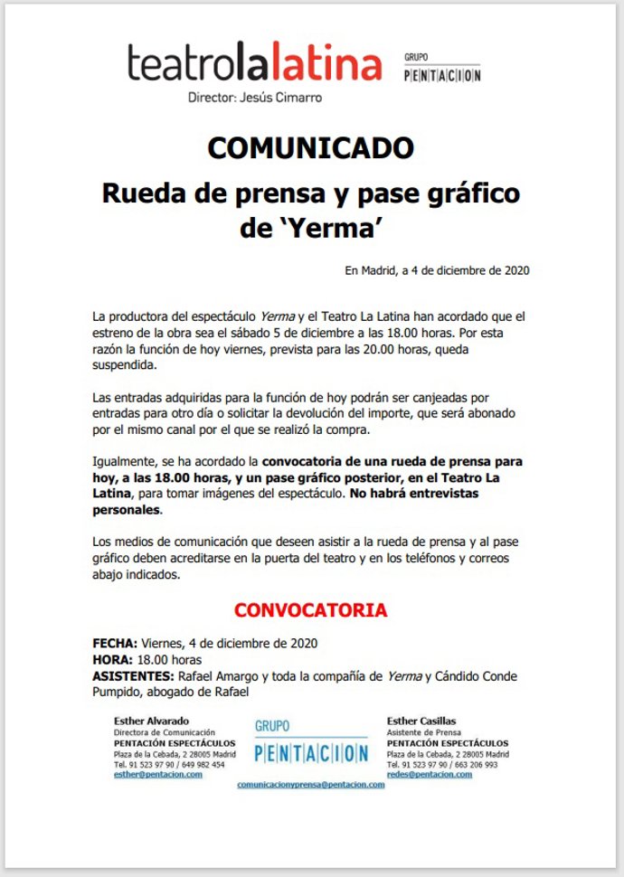 El Teatro La Latina ha enviado un comunicado informando que: "La productora del espectáculo Yerma y el Teatro La Latina han acordado que el estreno de la obra sea el sábado 5 de diciembre a las 18.00 horas. Por esta razón la función de hoy viernes, prevista para las 20.00 horas, queda suspendida".