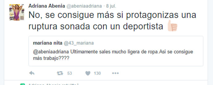 Adriana Abenia, que se ha incorporado en el programa de televisión Amigas y conocidas, lanzó un comentario en su cuenta de Twitter, que aun sin decir nombres se sabía perfectamente a quién iba dirigido... Alba Carrillo.