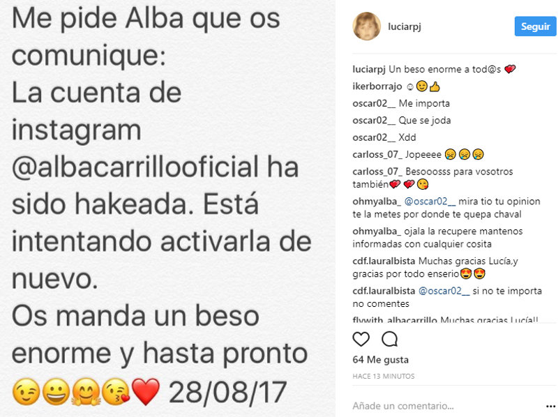 La vida de Alba Carrillo vuelve a sufrir un revés. Después de sus duros enfrentamientos con el padre de su hijo, Fonsi Nieto, por la custodia de su hijo y la guerra abierta con su ex marido Feliciano López, ahora Alba se ha encontrado con su cuenta de Instagram hackeada.