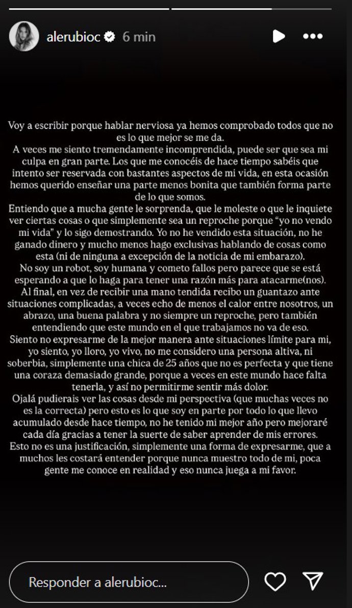Además, Alejandra echa de menos "el calor entre nosotros, un abrazo, una buena palabra y no siempre un reproche" -sin determinar de quién espera eso- aunque también entiende que "este mundo en el que trabajamos no va de eso". Un comunicado en el que vuelve a asegurar que no vende su vida y que no participa en el mismo negocio que toda su familia y que su chico -el que hemos visto en varias ocasiones hablando de su vida, de su familia, de su faceta de padre, de la situación de sus hermanos- y por tanto, no entiende las críticas que recibe continuamente.