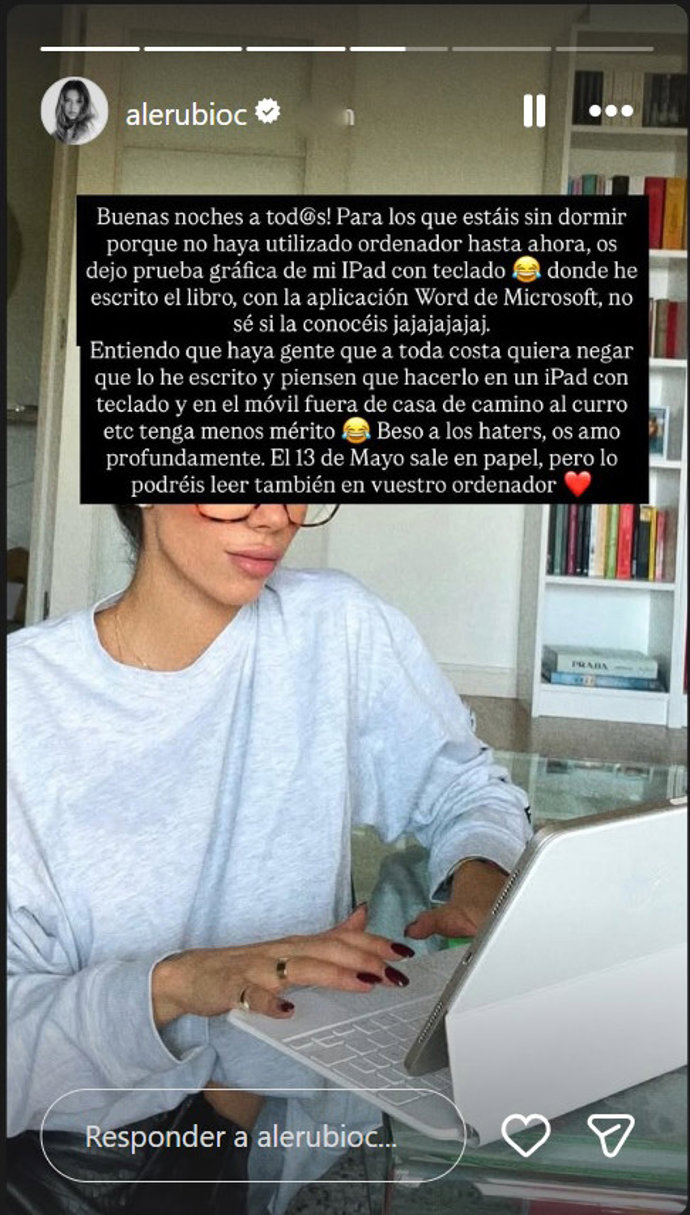 "Entiendo que haya gente que a toda costa quiera negar que lo he escrito y piensen que hacerlo en un iPad con teclado y en el móvil fuera de casa, de camino al curro, etc., tenga menos mérito", ha añadido sarcástica, aprovechando su comunicado para mandar "un beso a los haters, os amo profundamente", y promocionar su novela, "el 13 de mayo sale en papel, pero lo podréis leer también en vuestro ordenador".