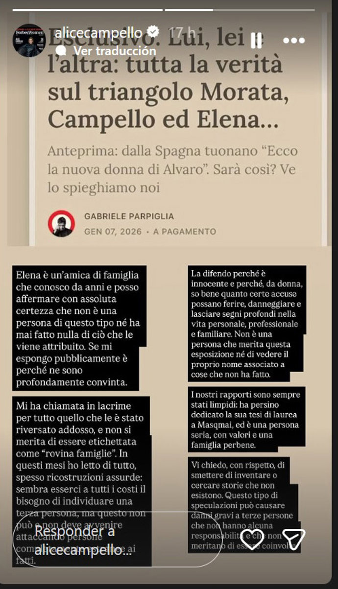 "Elena es una amiga de la familia a la que conozco desde hace años y puedo afirmar con absoluta certeza que no es una persona así ni ha hecho nunca nada de lo que se le atribuye. Si me expongo públicamente es porque estoy profundamente convencida de ello" ha expresado rotunda, poniendo la mano en el fuego porque no hay nada entre Morata y la italiana que, como ha revelado, "me llamó llorando por todo lo que le han echado encima, y no se merece que la tachen de rompefamilias".