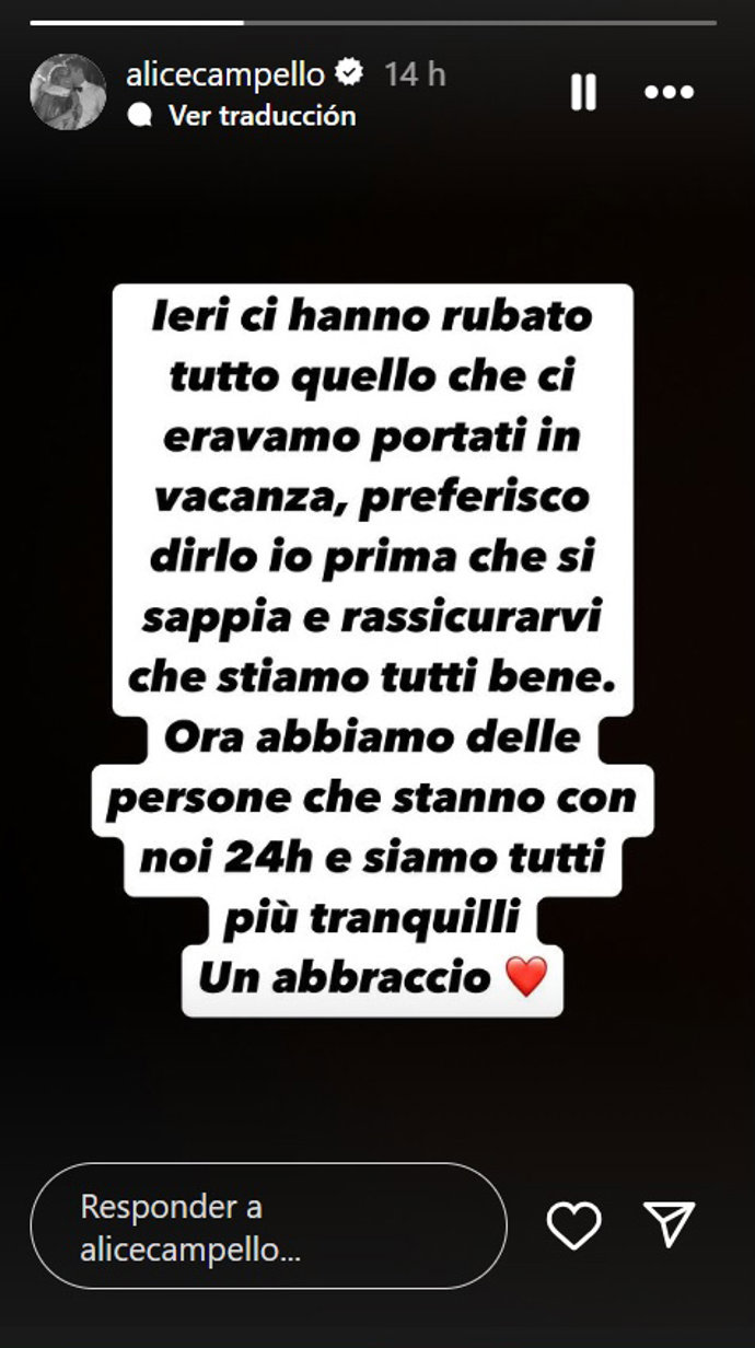 Poco antes, Alice publicaba un vídeo de sus hijos -los mellizos Leonardo y Alessandro (6), Edoardo (4) y la pequeña de la familia, Bella (1)- en el que mostraba la espectular mansión en la que está disfrutando de sus vacaciones en uno de los enclaves de la jet set internacional, Porto Cervo, con piscina y un gran jardín. Algo que habría dado una pista a los asaltantes, que por el momento se desconoce qué se llevaron exactamente.