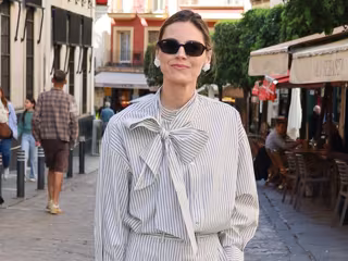 Este 2026 lo ha hecho con un dos piezas de rayas formado por pantalón y blusa con lazada al cuello que ha combinado con zapatos blancos, bolso coral y pendientes de nácar. La actriz ha recogido su melena rubia en un moño bajo y, cual diva del séptimo arte, no se ha quitado sus gafas de sol, aprovechando el sol reinante en la ciudad del Guadalquivir.