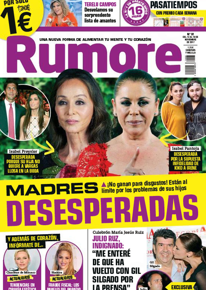 La portada de la revista Rumore cuenta con Isabel Pantoja e Isabel Preysler bajo el titular: "Madres desesperadas" y continúan: "¡No ganan para disgustos! Están al límite por los problemas de sus hijos".