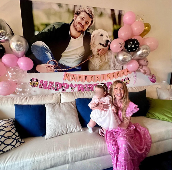 En otra de las instantáneas, la presentadora y la cumpleañera posan sentadas en el sofá ante la imagen de gran tamaño de Aless y su perro que preside el salón, también decorado con banderines de color rosa de 'Happy birthday' y globos en diferentes tonos, algunos de Minnie.