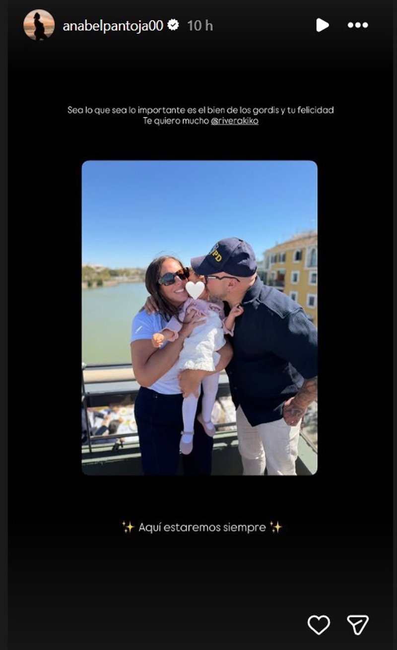 Con una fotografía en la que aparecen Kiko y ella junto a su hija, durante la pasada Semana Santa, Anabel escribe: "Sea lo que sea, lo importante es el bien de los gordis y tu felicidad. Te quiero mucho Kiko. Aquí estaremos siempre".