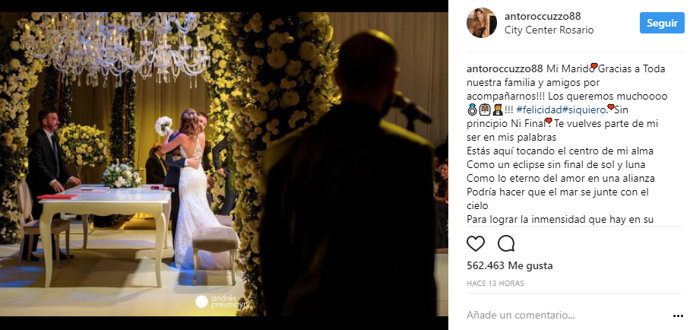 Así lo demuestra el título que acompaña a la fotografía que subió Antonella a Instagram, una auténtica declaración de amor: "Mi Marido. Gracias a Toda nuestra familia y amigos por acompañarnos!!! Los queremos muchoooo!!! #felicidad#siquiero. Sin principio Ni Final. Te vuelves parte de mi ser en mis palabras. Estás aquí tocando el centro de mi alma. Como un eclipse sin final de sol y luna. Como lo eterno del amor en una alianza. Podría hacer que el mar se junte con el cielo. Para lograr la inmensidad que hay en su vuelo. Que me regala tu mirada y tu desvelo. Bajo la luna cuando danzas en mis sueños. Te voy a amar, y me amarás. Te amo sin principio ni final. Y es nuestro gran amor. Mi ángel de la eternidad #graciasabel".